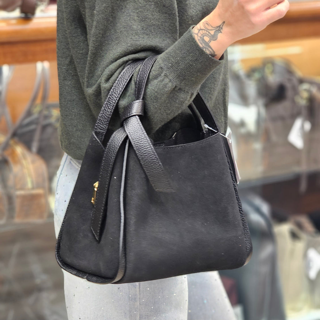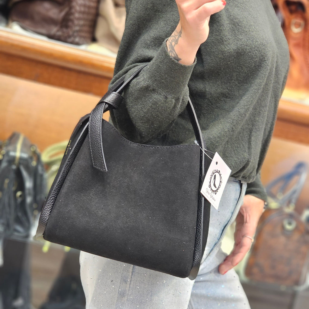 Borsa in campscio e pelle Made in Italy. La chiusura è con due bottoncini e presenta una tasca separatoria centrale con zip. È possibile utilizzare la borsa anche a tracolla. La tracolla è inclusa. Per misure e ulteriori dettagli scrivici direttamente in chat: saremo felici di darti tutte le info!