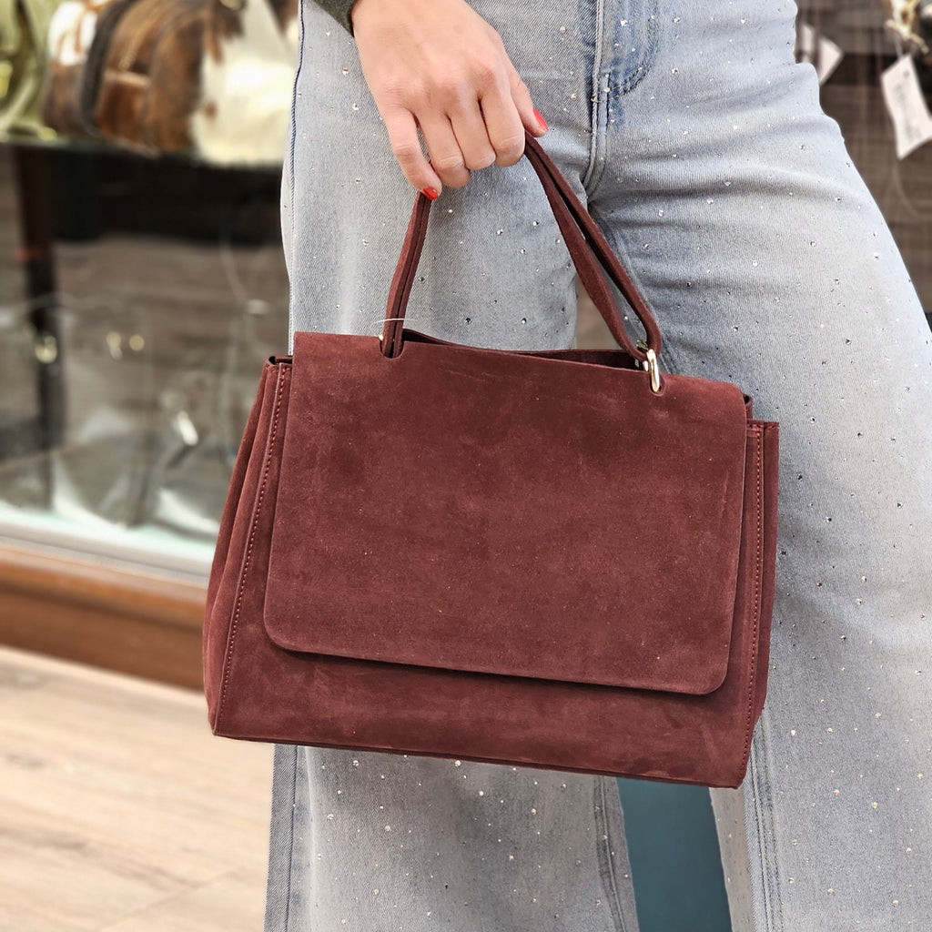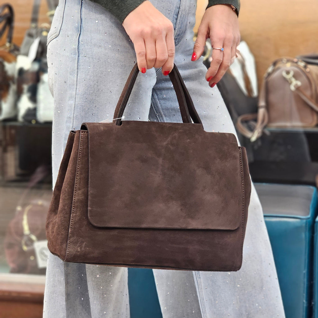 Borsa in camoscio Made in italy. La chiusura è con patella e bottone centrale. La maniglia è allungabile in modo da poterla portare sotto spalla. La borsa presenta una tasca laterale interna con zip. Per misure e ulteriori dettagli scrivici direttamente in chat: saremo felici di darti tutte le info!